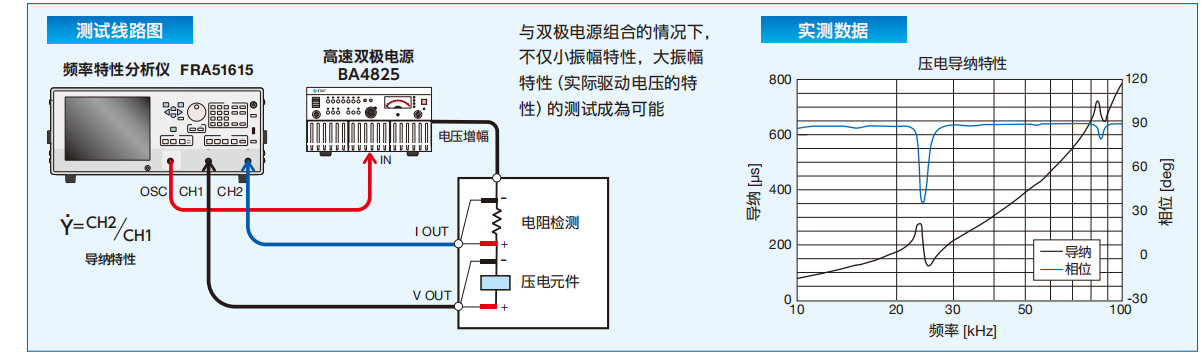 可对压电驱动器等使用的压电元件的电气共振性进行高精密度测测试。RA51615与FFT分析仪等不同,可细致的对特定频率范围进行分辨,拥有高相精度,可得详细得知共振点附近的特性。