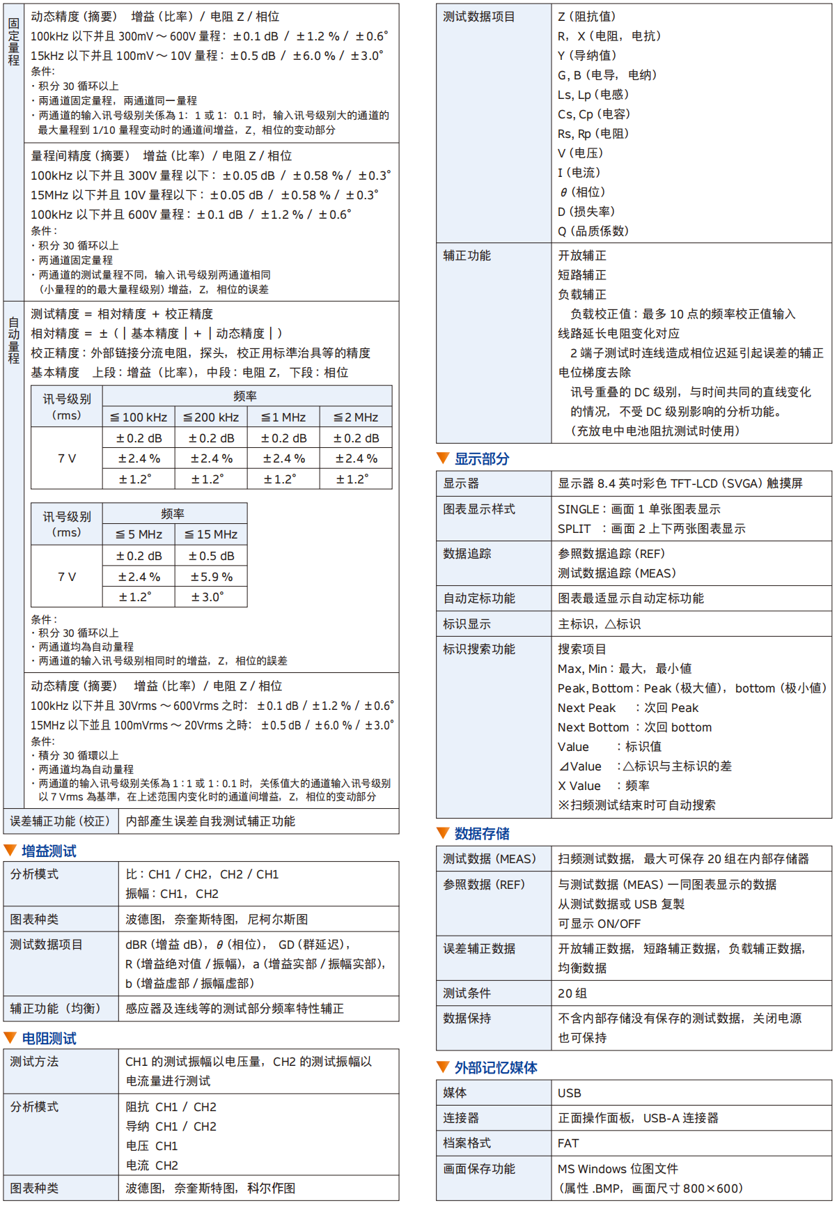 电子零件、压电元件的共振特性测试、有外施电压的积层陶瓷电容特性测试、电池内部电阻测试、开关电源回路环形增益/相位测试、无线供电传送效率测试、滤波器的输入输出特性测试仪、振动分析、电化学阻抗、伺服控制测试、尖端生物技术研究分析等