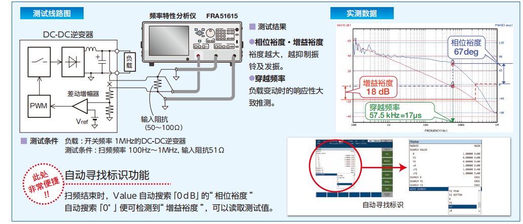 进行实际驱动状态的DC-DC逆变器的环路増益特性测试,通过对相位裕度,増益裕度对迴路稳定性的定量进行评价。依靠600V CAT II / 300V CAT III,非绝缘型PFC迴路可以直接与商用电源连接进行测试。