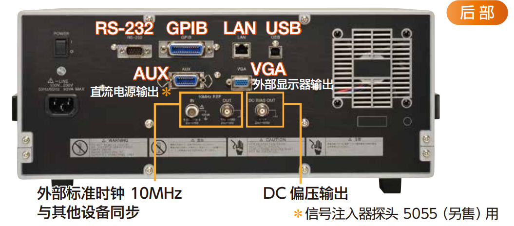 接口:GPIB, USB, LAN, RS-232, VGA,标准配备GPIB,USB, LAN, RS-232接口。可构建自动测试系统。另外,在背面配备了 VGA 连接器作为外部显示器。关于其他输出连接器等,请参阅背面照片图。