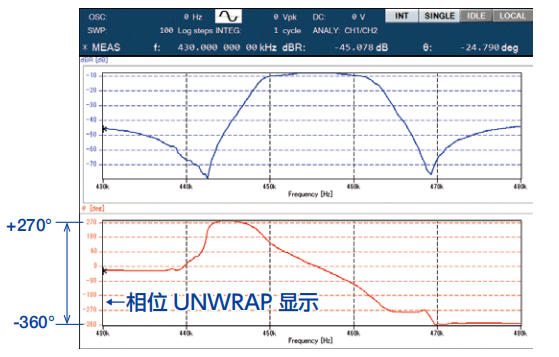 •相位UNWRAP显示:按0°、180°、360°不折回地连续显示相位,还可显示超过+360° 的相位。