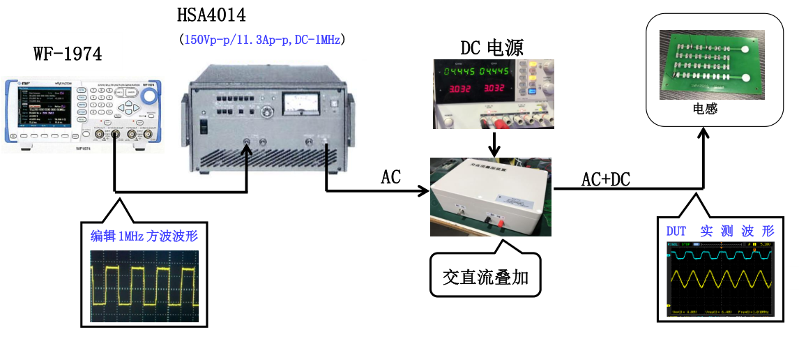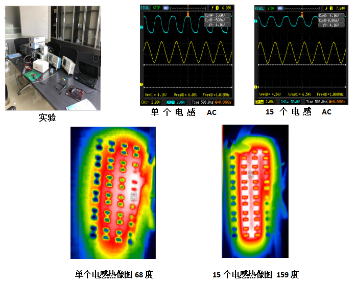 再通过叠加电路叠加DC 4.1A电流与1MHz电流混合输出给被测电感(AC 4.2App+DC 4.1A)。通过示波器监控施加到电感上的电流和电压波形、用热像仪监测被测电感温度,